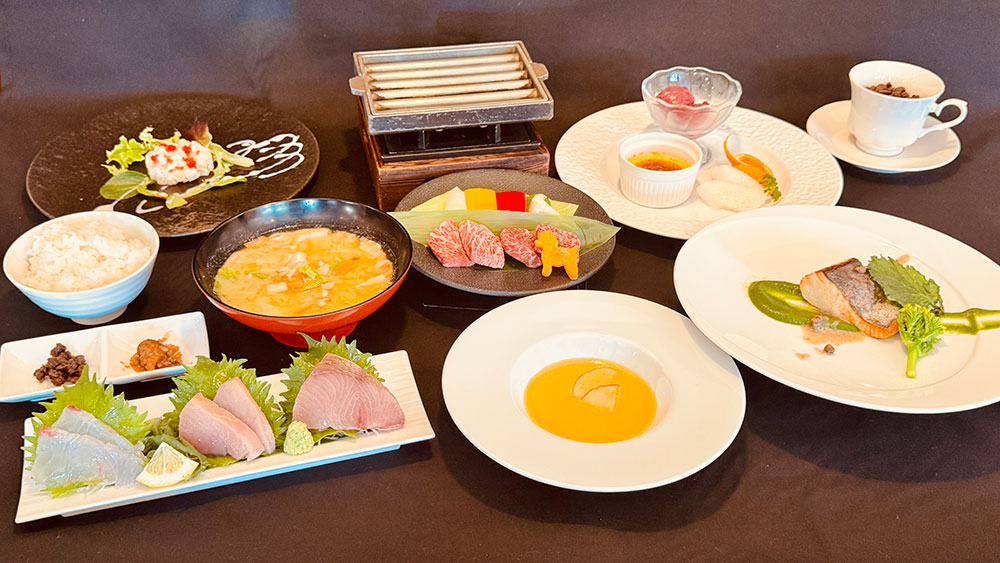 鳥取和牛メインのフルコースディナー 大山の有機豊かな土と大自然の光のなかで育まれた瑞々しいお野菜やお肉、境港で水揚げされたお魚を飾らない味付けで素材本来の美味と旬の香をお楽しみください。 |